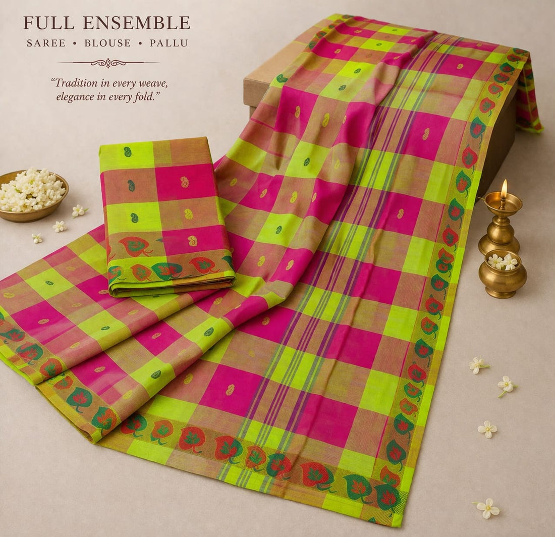 Elegant Green Pure Cotton Vaira Oosi Saree with Golden Zari Border