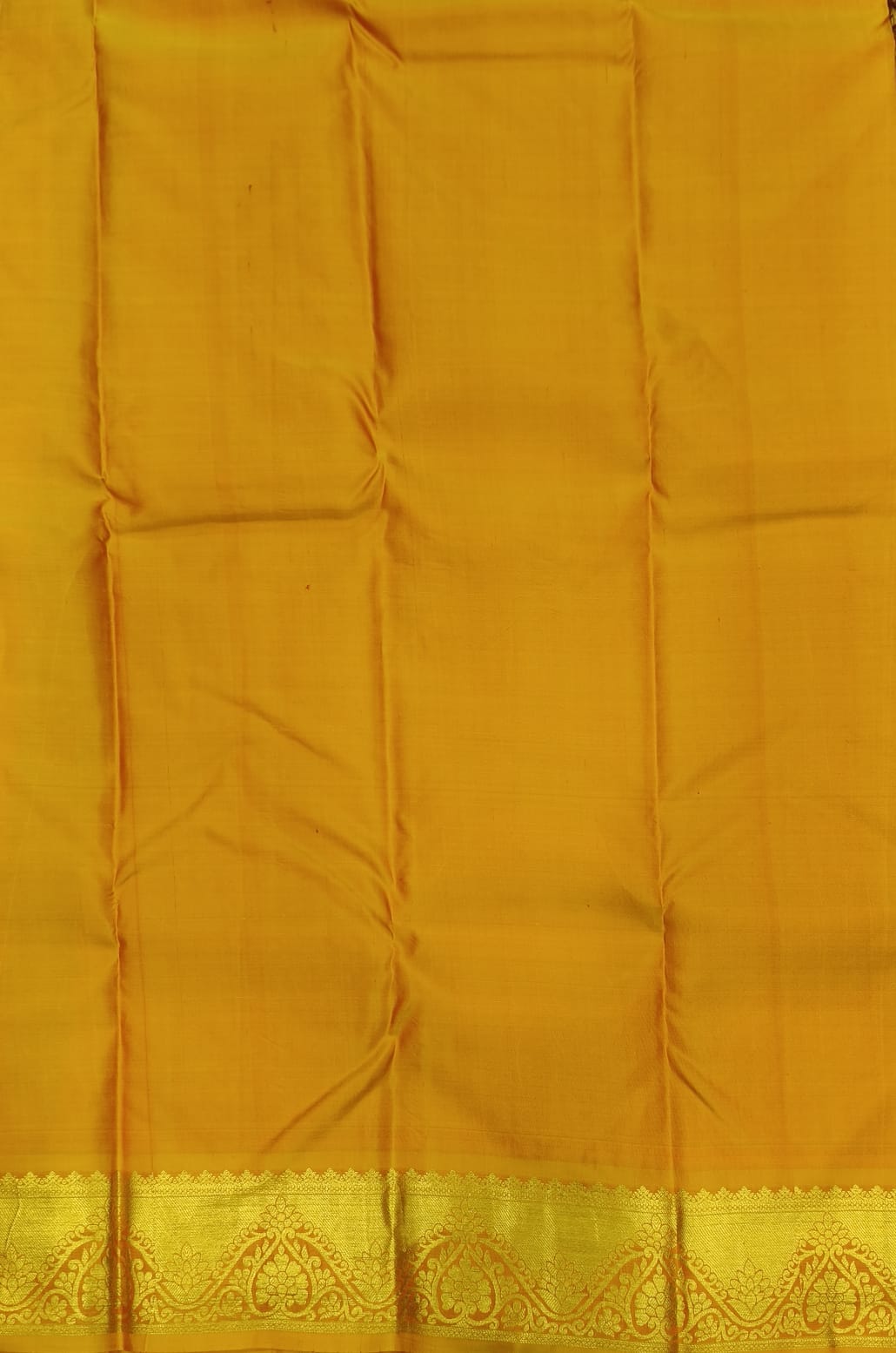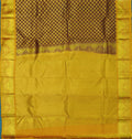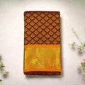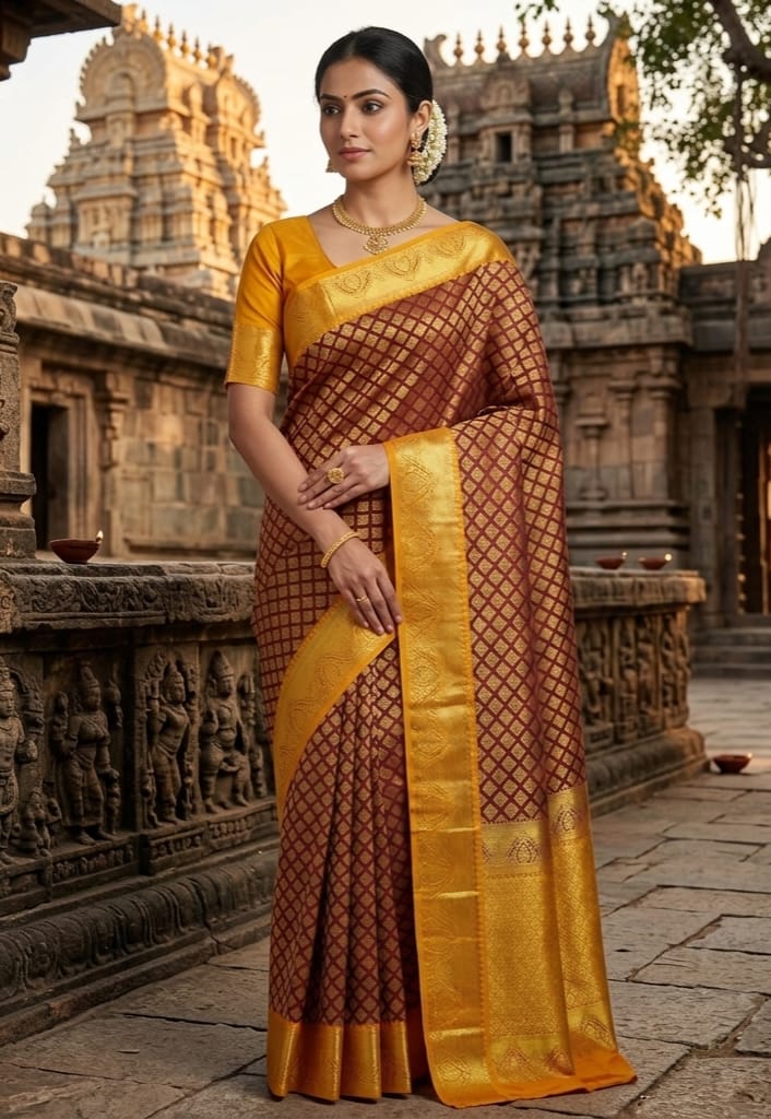Step into timeless tradition with this exquisite Kanchipuram Silk Saree, featuring a deep maroon body adorned with intricate golden diamond motifs. The vibrant golden-yellow border, woven with floral and paisley designs, adds a regal charm that makes this saree perfect for weddings, festive occasions, and cultural celebrations.